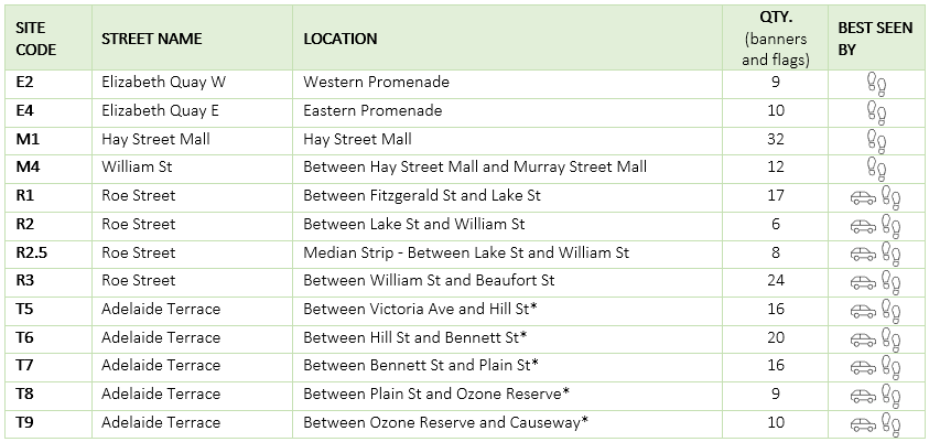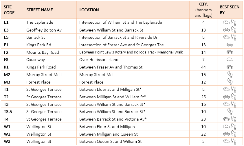 *From 01 July 2025: Sites on St Georges Terrace and Adelaide Terrace change. Please be careful to read the location and quantity for each site – these have all changed since previous years.