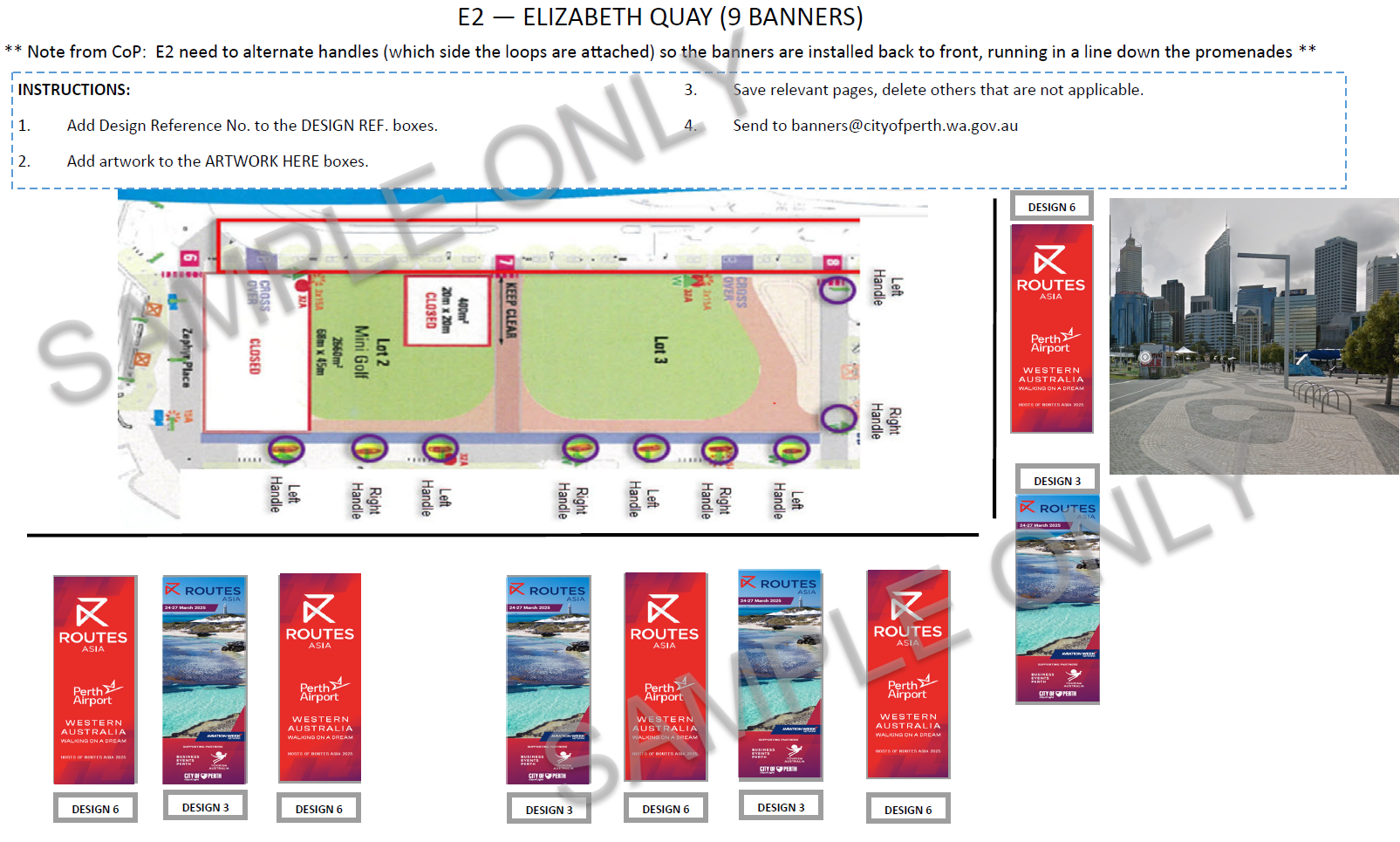 E2 – Elizabeth Quay W – Western Promenade and E4 – Elizabeth Quay E – Eastern Promenade use both Small Fabric Banner – Type 2 (a) and Type 2 (b). Refer to Book 900 – Banners and Flags Specification. These banners have a unique display, so that 1 banner is facing the oncoming pedestrians, while the next banner along faces the opposite direction.