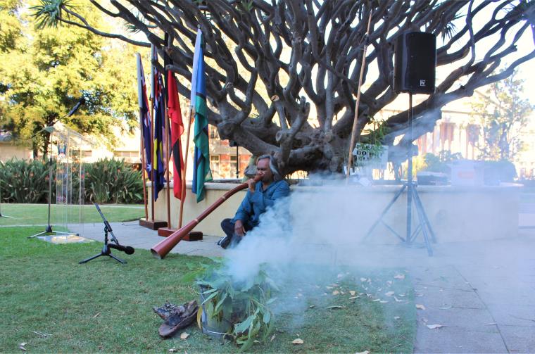 Image: Michael Fuller performs Didgeridoo at the City's Reflect Reconciliation Action Plan launch.