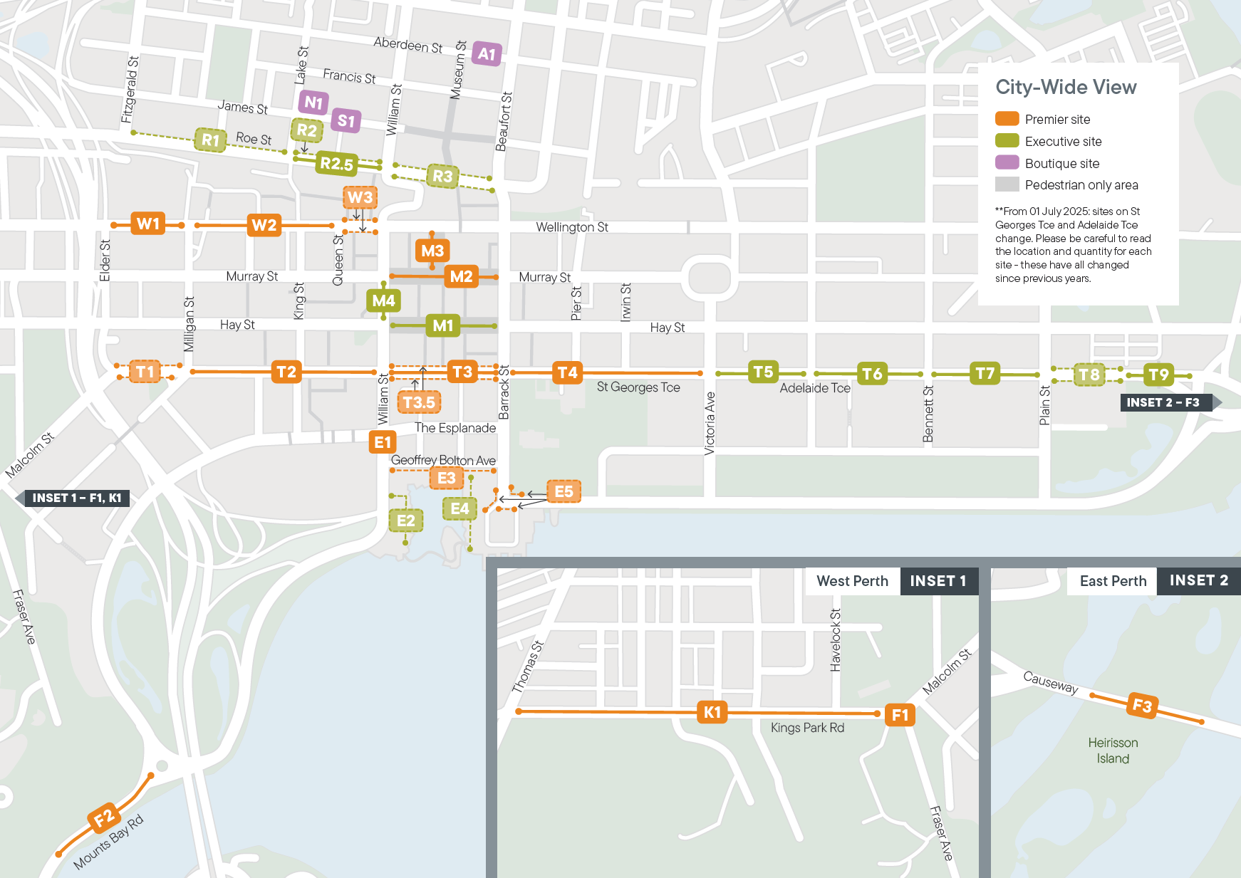 From 01 July 2025: Sites on St Georges Terrace and Adelaide Terrace change. Please be careful to read the location and quantity for each site – these have all changed since previous years.