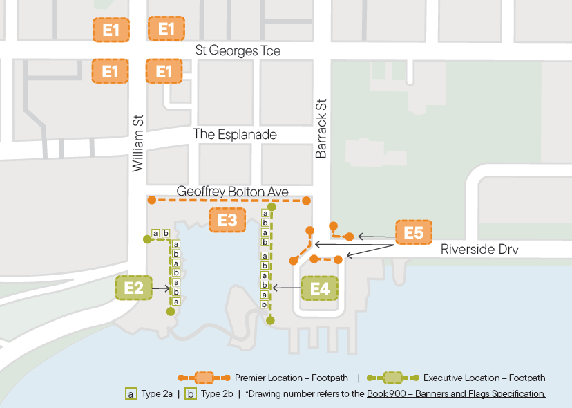 E2 – Elizabeth Quay W – Western Promenade and E4 – Elizabeth Quay E – Eastern Promenade use both Small Fabric Banner – Type 2 (a) and Type 2 (b). Refer to Book 900 – Banners and Flags Specification. These banners have a unique display, so that 1 banner is facing the oncoming pedestrians, while the next banner along faces the opposite direction.
